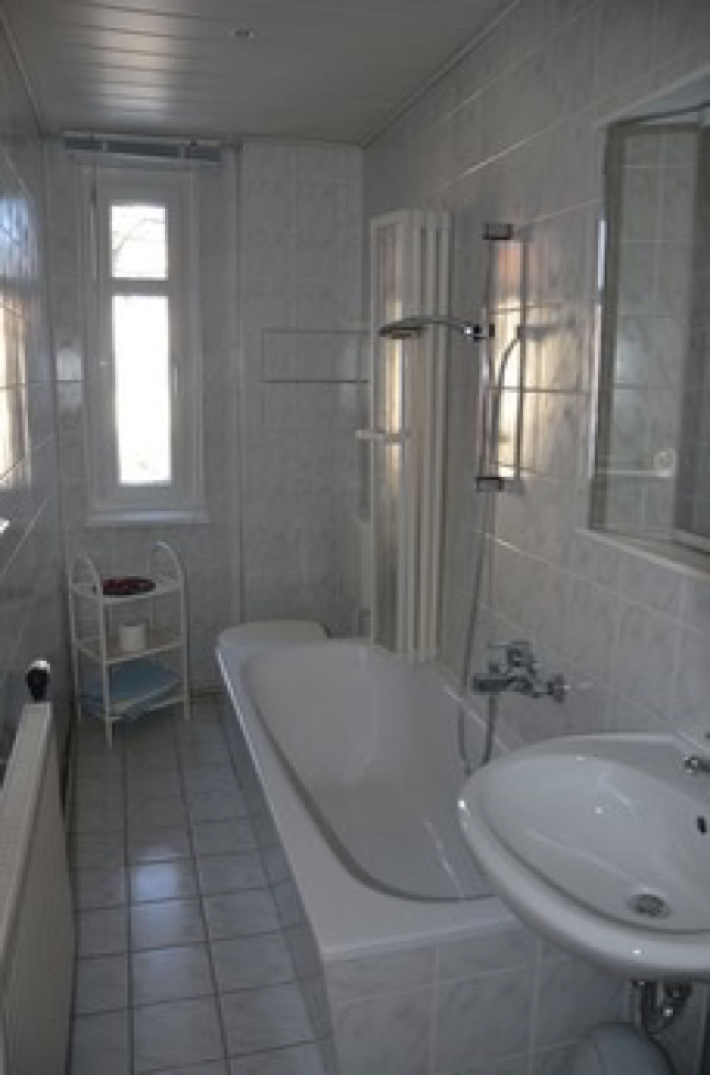Zum gefliesten Badezimmer gehört neben dem WC und dem Waschbecken eine Badewanne.